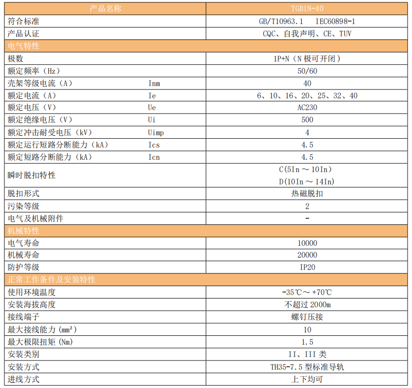 TGB1N-40 小型斷路器(以下簡稱斷路器)主要適用于交流 50/60Hz,額定工作電壓 230V,額定電流至 40A 的家用及類似場所的電力線路設施和電氣設備進行過載和短路保護之用,亦可用于不頻繁地通斷操作。尤其適用于工業和商業的照明配電系統。